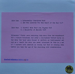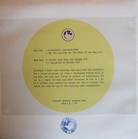 COMMENTS: ITALIAN ACETATE BOOTLEG ON BLACK VINYL. PLAIN COVER WITH INSERT. 30 HAND NUMBERED COPIES PRESSED ON BLACK VINYL AND A FURTHER 15 COPIES RELEASED AS A PICTURE DISC WHICH COMES IN A BOX WITH A CERTIFICATE AND T-SHIRT.