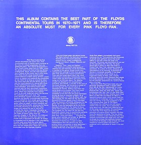 COMMENTS: GERMAN BOOTLEG WITH DELUXE FULL COLOUR COVER AND PINK PRINTED LABELS. COPIES EXIST (ABOVE RIGHT) WITH A GREEN TINTED COPY OF THE SLEEVE WITH THE RECORD IN GOOD STEREO. 'CAREFUL WITH THAT AXE EUGENE' IS SAID TO BE 10 SECONDS SHORTER ON THIS COPY (11.20). MATRIX NUMBERS ON THE RE-ISSUES ARE PF-THE EARLY TOURS SEITE A/B.
